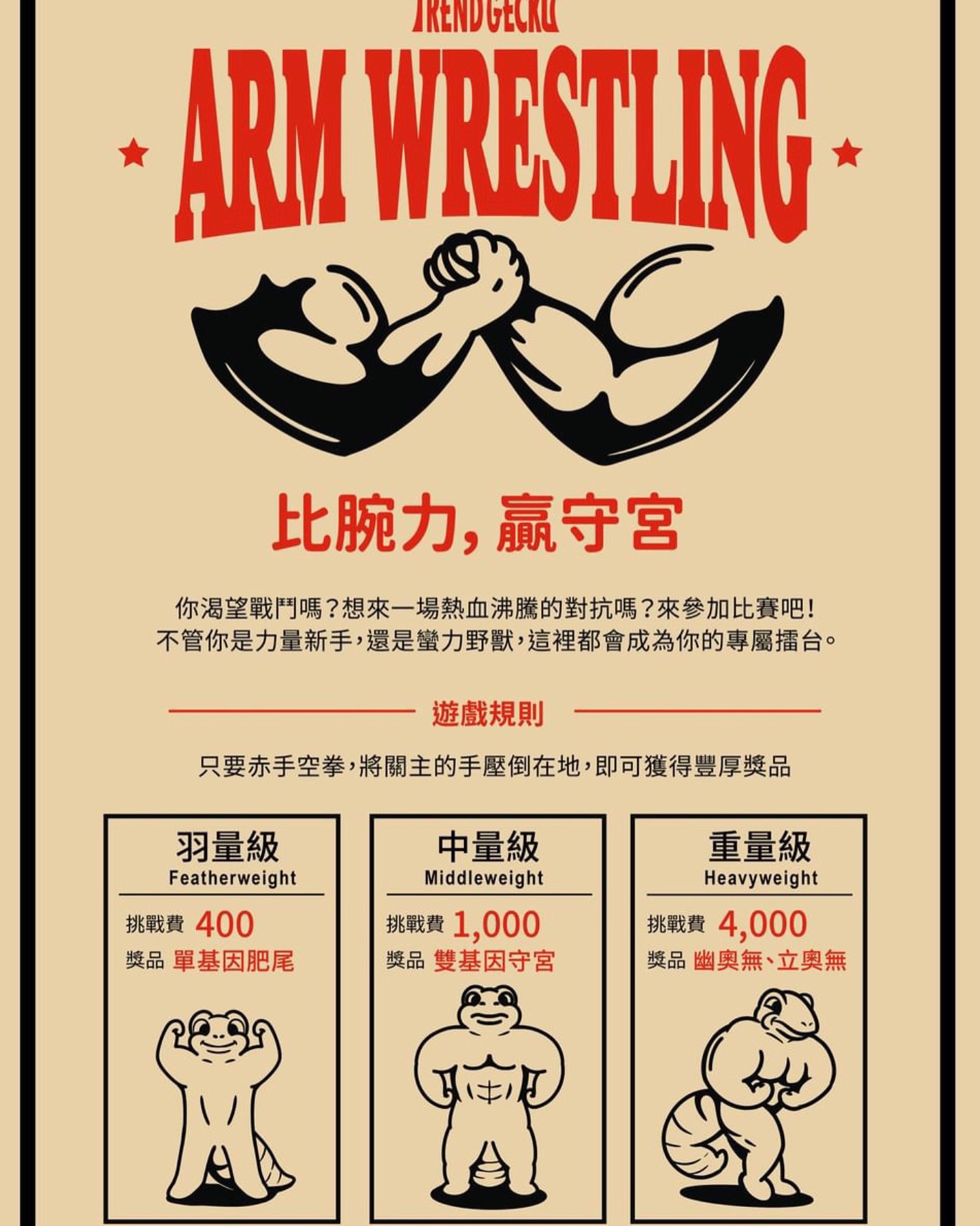 遊戲規則:掰手腕贏版主我 就可以帶肥尾守宮回家嚕 ,品系由價位決定(付的挑戰費用越多贏得守宮越好)輸家可無限制挑戰 贏家需等下次展覽在挑戰